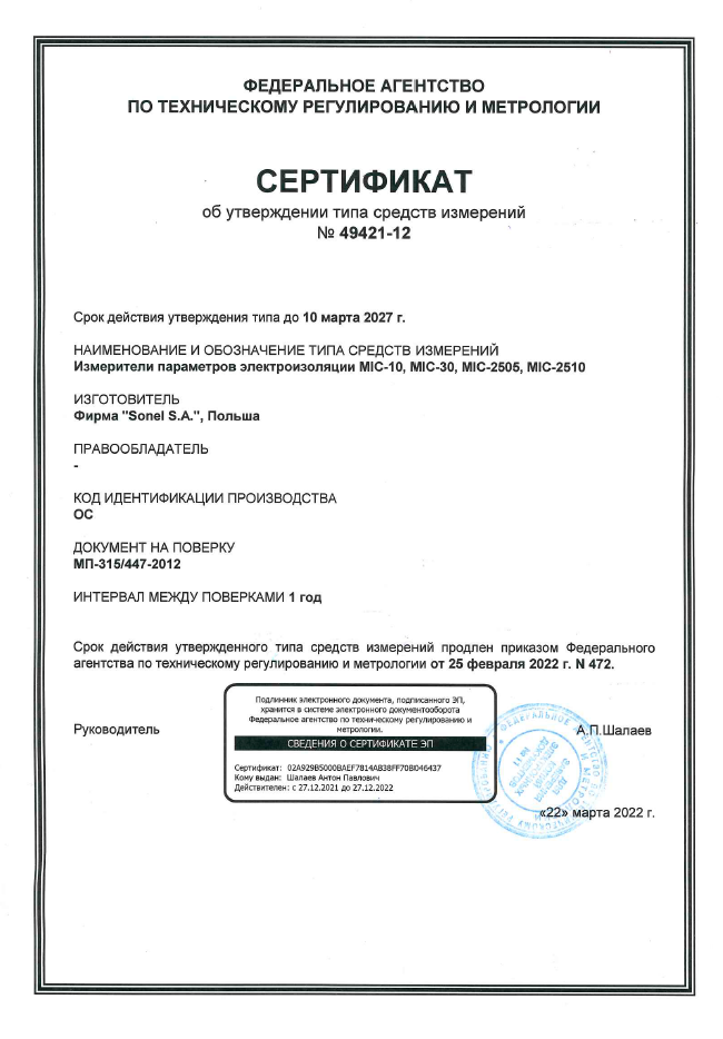 Измеритель параметров электроизоляции MIC-10 с первичной поверкой